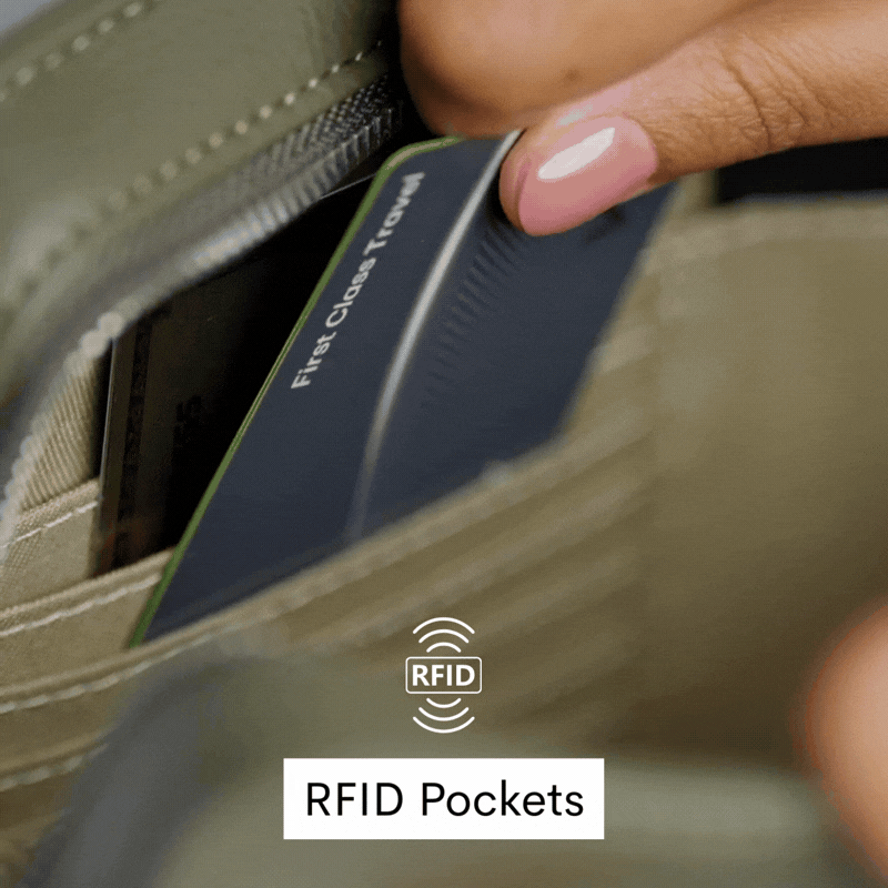 - 12 smart pockets to keep you organized—no wallet needed: 7 RFID card slots, 1 RFID passport pocket, 2 small open pockets (for phone, AirPods, etc.), 1 middle zippered pocket (for cash or essentials), 1 lockable zippered back pocket