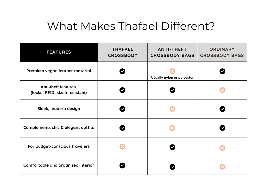 The Thafael anti-theft crossbody travel bag is made for women who want to explore the world safely and in style. Whether you’re looking for a travel purse that’s slash-proof, a crossbody bag for European travel, or a stylish anti-theft bag that doesn’t look bulky, this bag delivers. With 7 secure compartments, premium vegan leather, and a slim, elegant profile — it’s the ultimate crossbody for solo female travelers.
